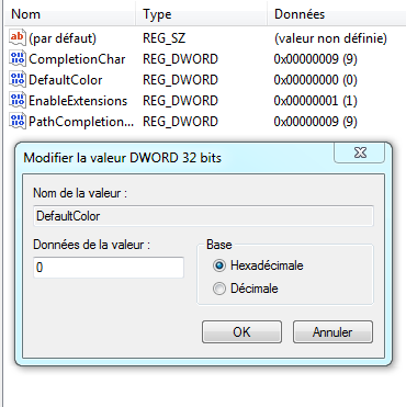 - Pour en modifier la valeur, double-cliquer sur la valeur "DefaultColor", la valeur par défaut est "0" .