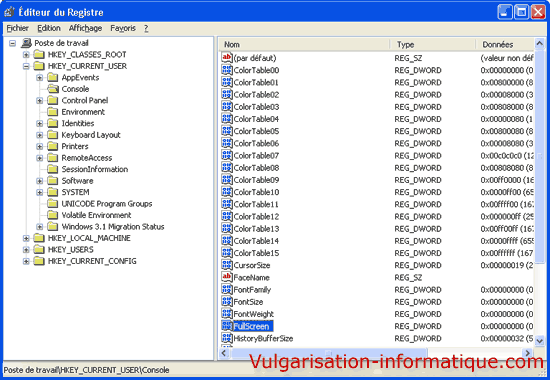 Cliquez sur Démarrer, Exécuter puis tapez regedit et rendez vous à la clé suivante : HKEY_CURRENT_USER\Console. Modifiez ensuite la valeur DWORD nommée FullScreen et affectez-lui la valeur 1.