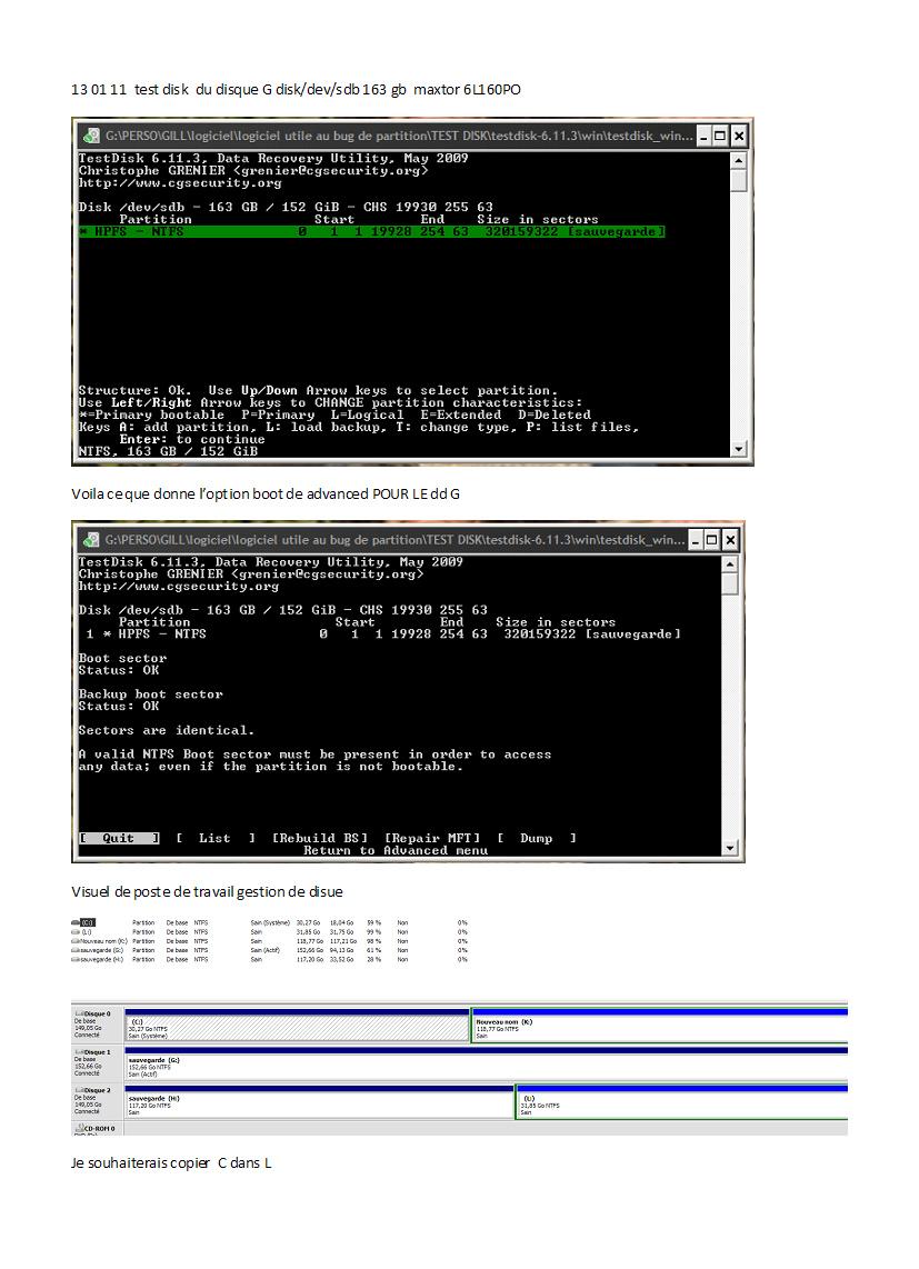 Elle concerne donc le boot sector altéré de l'un des autres disques présents dans l'ordinateur. En conséquence, ce sont les copies d'écran de TestDisk pour celui-ci, reflétant l'erreur, qu'il importe de fournir en lien direct (outil "Image") dans ton message.