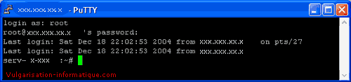 Indiquez l'adresse de votre serveur distant dans la zone Host Name et Cliquez ensuite sur le bouton Open. L'interface de Putty change et laisse place à une console. La première ligne vous demande de vous logguer à votre serveur, c'est à dire de vous authentifier. Tapez root pour disposer des droits maximum et appuyez sur la touche entrée.