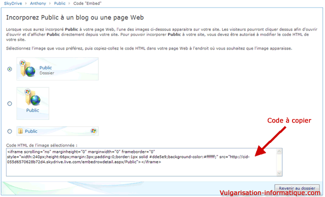 Vous pouvez bien sûr à tout moment modifier ces autorisations. Si vous poussédez un blog ou un site Web, forum, etc et que vous souhaitez directement partager le contenu de vos dossiers ou vos fichiers, il vous suffit de vous rendre dans la ou les dossiers concernés (ou sur les fichiers concernés) puis de cliquer dans la barre d'outils sur Code "Embed". Cela va vous donner accès à différents types d'images cliquables qui permettront à vos visiteurs d'accéder directement au dossier. Choisissez l'image de votre choix en sélectionnant la case à cocher sur la gauche. Le code est ensuite modifié dans la zone de texte. Récupérez ce code et incorporez-le dans votre page Web :
